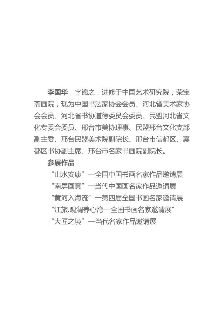 李国华,字锦之,进修于中国艺术研究院,荣宝斋画院,现为中国书法家协会会员、河北省美术家协会会员、河北省书协道德委员会委员、民盟河北省文化专委会委员、邢台市美协理事、民盟邢台文化支部副主委、邢台民盟美术院副院长、邢台市信都区、襄都区书协副主席、邢台市名家书画院副院长。